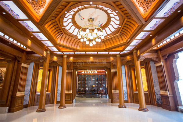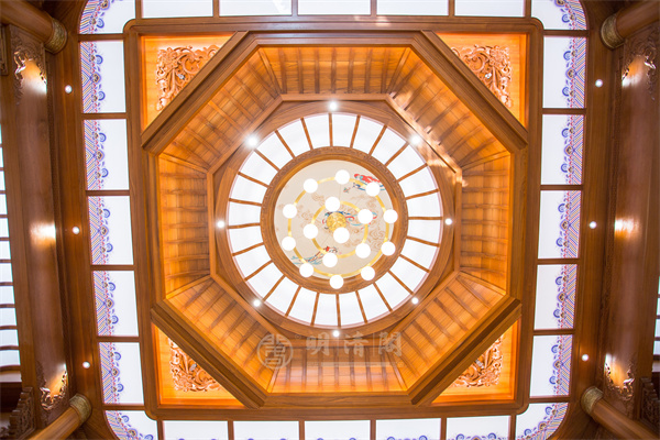 明清閣該案例藻井穹頂如傘蓋隆起,榫卯精工構(gòu)筑,無需一釘而穩(wěn)如磐石。木質(zhì)的框架結(jié)構(gòu)搭配細膩的雕刻與彩繪,每一格中都蘊含著中式傳統(tǒng)圖案的韻味,在燈光的映照下,更顯金碧輝煌,為整個空間增添了一抹大氣與莊重。其形上圓下方,合"天圓地方"之道,非惟裝飾,更乃禮制象征,唯皇家與敕建寺觀可享,彰顯封建等級之尊。